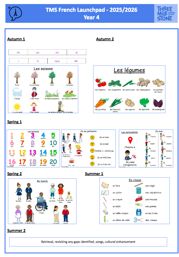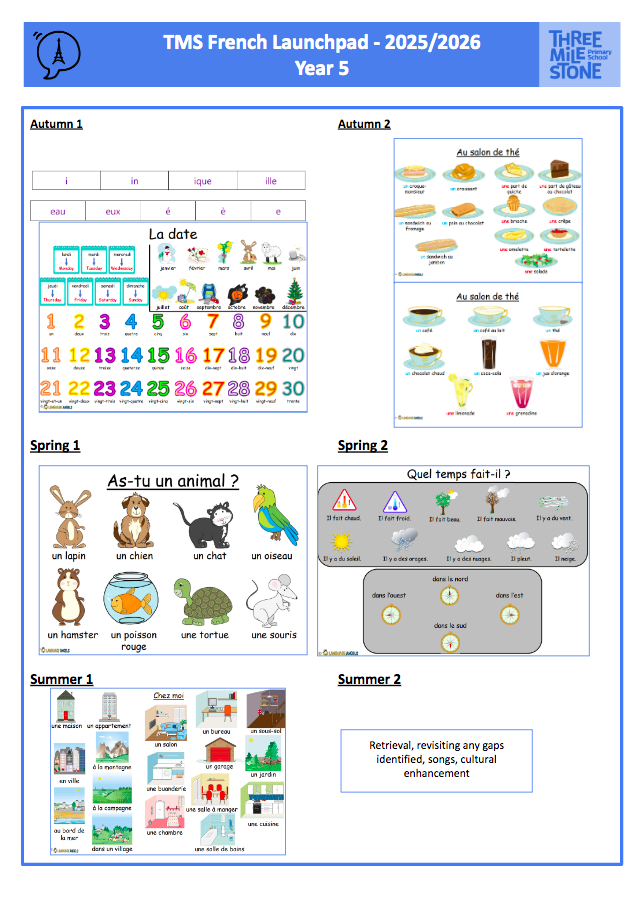 Units, where possible and appropriate, will be linked to class topics and cross curricular themes. Children will build on previous knowledge gradually as their foreign language lessons continue to recycle, revise and consolidate previously learnt language whilst building on all four language skills: listening, speaking, reading and writing. Knowledge and awareness of required and appropriate grammar concepts will be taught throughout all units at all levels of challenge. Teachers are provided with a Progression Map and Grammar Grid (downloadable from the “Curriculum Guidance” area of the Language Angels website) to ensure all children are progressing their foreign language learning skills and are taught the appropriate grammar at the right time in their foreign language learning journey. This is also set out in the French @TMS document. Grammar rules and patterns will be taught by level of challenge: